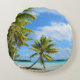 Throw pillow with a hanging palm tree on a white sand beach of a tropical island in the Pacific Ocean belonging to the Tahiti archipelago French Polynesia.