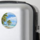 Round souvenir photo magnet with a hanging palm tree on a white sand beach of a tropical island in the Pacific Ocean belonging to the Tahiti archipelago French Polynesia.