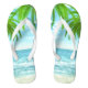 Fun, tropical scene with blue ocean waves lapping at the seashore and green palm tree fronds on these custom flip flop sandals.