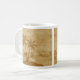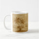 Design of an island with palm trees silhouetted on parchment paper background printed on both sides of mug. Mug style, colour and size are customisable.