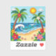 A coastal sticker in a paper quilling style ai illustration of two palm trees, the sun, ocean waves, a beach and tropical flowers.