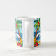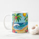 A coastal Coffee Mug in a paper quilling style ai illustration of two palm trees, the sun, ocean waves, a beach and tropical flowers.