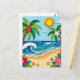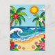 A cute postcard in a paper quilling style ai illustration of two palm trees, the sun, ocean waves, a beach and tropical flow4ers. A pretty way to say hi to someone while you are travelling or on vacation!
