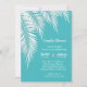 White palm fronds on a turquoise background (You can change to any colour background to ANY COLOR!) on these wedding shower invitations can also be used for a wedding anniversary, birthday party, bridal shower, retirement party and more, just change the wording. MATCHING items in our store.