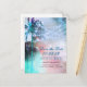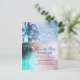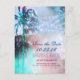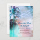 Romantic vintage save the date with rustic old palm trees, watercolor ombre blue turquoise background and dreamy string lights. Perfect save the date postcard for destination and beach weddings.