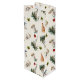Beach Christmas gift bag for wine, or a bottle.. Beach sand "snowmen", sandy Christmas trees, and decorated palm trees, are all part of the pattern that covers this ecru / off-white gift bag. A red banner across the front holds your choice of greeting. "Seas and Greetings" is the sample wording in script.