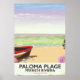 Paloma Plage, French Riviera travel poster of a old wooden fishing boat on the sandy france beach.