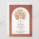 Tropical dried palm leaves, pampas grass and protea flowers terracotta arch baptism invitation. This pretty design showcases an arch frame on terracotta stained background. In the frame there is a watercolor bouquet of dried palm leaves, protea flowers and pampas grass.