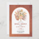 Tropical dried palm leaves, pampas grass and protea flowers terracotta arch wedding bridal shower invitation. This lovely wedding design features an arch frame on terracotta stained background. In the frame there is a watercolor bouquet of dried palm leaves, protea flowers and pampas grass.