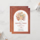 Tropical dried palm leaves, pampas grass and protea flowers terracotta arch wedding rehearsal dinner invitation. This lovely wedding design features an arch frame on terracotta stained background. In the frame there is a watercolor bouquet of dried palm leaves, protea flowers and pampas grass.