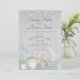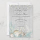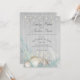 Seaside beach wedding invitation with weathered grey wood shiplap and pampas grasses with pretty seashells and starfish adorned in string lights. Romantic and rustic, boho beach wedding invitation.