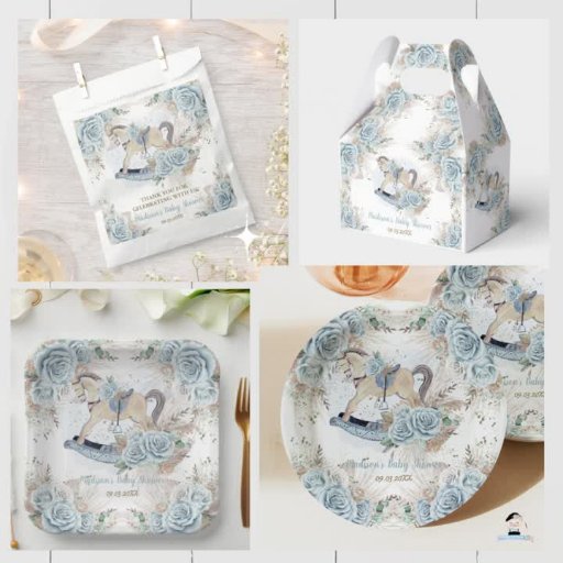 This RSVP with a QR code card features a whimsical vintage wooden rocking horse, pretty blue roses and earthy tone pampas grass. Matching items available in store! (c) The Happy Cat Studio