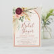 Celebrate the bride to be with this Boho Floral Arch Bridal Shower invitation, featuring an elegant watercolor floral bouquet of burgundy red chrysanthemum blooms, blush pink roses, eucalyptus greenery, pheasant feathers, dried pampas grass foliage, golden autumn leaves and more. The design is framed by a graceful yet modern arch in warm terracotta rust orange and soft oatmeal beige for a natural, earthy feel. With its modern rustic boho style, this invitation sets the perfect tone for a western, boho, or fall celebration. Pair with coordinating signs, thank you cards, games, favours, and décor from the Boho Floral Arch event suite for a beautifully cohesive bridal shower.