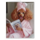 A hyper-realistic image of a charming poodle relaxing in a pink bathrobe with a matching towel wrapped around its head. The adorable dog is comfortably sitting on a chair, holding a magazine featuring another poodle on the cover. Its playful expression and luxurious spa-like setting make this scene both cute and amusing.