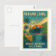 Retro-style travel poster of the Panama Canal, featuring a large cargo ship passing through the canal lock gates, with tropical palm trees and lush green hills in the background. A bright sky with birds flying emphasizes freedom and trade between the Atlantic and Pacific Oceans.