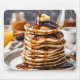 Tall stack of pancakes with dripping syrup and a pat of butter