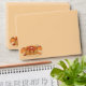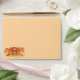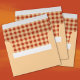 The perfect fall envelope with a watercolor illustration of some pumpkin spice pancakes on the outside left corner and a rusty brown Buffalo plaid pattern inside .