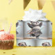 A joyful panda wearing a bow and flowers twirls a colourful rainbow hula hoop while wearing a small pleated skirt and saddle shoes.