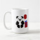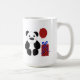 A cute celebration mug featuring a panda bear holding a red balloon with a red wrapped package beside him.