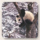 Panda cub playing on tree covered with snow, coaster