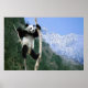 A Panda In a tree poster.has a black and white panda standing up at the top of a tree with a mountain view behind him and a blue sky.this is a beautiful photo.
