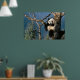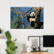 A Panda In a tree poster.has a black and white panda sitting up at the top of a tree with a forest behind him and a blue sky.this is a beautiful photo.