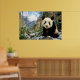 A Panda in the mountain.has a black and white panda sitting with with a forest view behind him and a trees around them and snow on the ground.this is a beautiful photo.