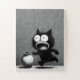 A hilarious black-and-white scene of a wide-eyed kitty sprinting past a ceramic vase, mouth agape in cartoon panic. The grainy, minimalist style makes each piece easy to place and fun to assemble—perfect for kids, families, and cat lovers. Choose your preferred size and piece count on Zazzle.