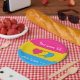 Paper plate with the pansexuality pride flag with little hearts in the centre of the design. Pink, yellow, and blue flag of the pan pride movement; with an editable text field for your name or message