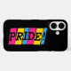 Phone case for Apple iPhone 16 with text in the colours of the pansexuality pride flag. Pink, yellow, and blue flag of the pan pride movement on a black background