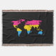 Design with map of world in the colours of panexuality pride flag with rainbow stripes of blue, pink and blue; pan pride design on black background by pinkbrickroad
