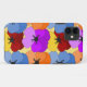 This phone case has a Spring design of purple, blue, orange, and red with yellow pansies layered on each other on a field of yellow.