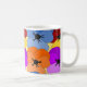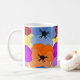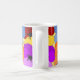 This mug has a Spring design of purple, blue, orange, and red with yellow pansies layered on each other on a field of yellow.