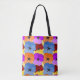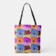 This tote bag has a Spring design of purple, blue, orange, and red with yellow pansies layered on each other on a field of yellow.