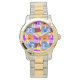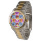 This women's watch has a Spring design of purple, blue, orange, and red with yellow pansies layered on each other on a field of yellow.