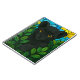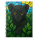 A cute panther cub peeps out from behind from shrubs. The art is digitally created and is stained glass themed.