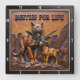 This dramatic square wall clock features a highly dimensional, close-up illustration of a brown panther (or leopard) and a white, happy goat standing side-by-side. The entire design is rendered in muted brown, tan, and dark leather-like tones, strongly suggesting a deep sculpted relief or Sculpted Leather Look. The panther has detailed spots and is positioned on the left, while the goat is on the right, smiling with large curved horns. They are surrounded by an elaborate circular wreath of gnarled, dark tree branches and thick leaves. The background is a dark, heavily textured leather panel. The large, three-dimensional embossed text "BESTIES FOR LIFE" is carved across the top center in a bold, golden serif font. The clock face features a simple clock face border with large, white, numbered tick marks (1 to 12) integrated into the outer frame. The artwork is surrounded by a thick, dark brown decorative border that resembles a black wood frame.
