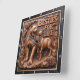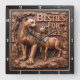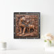 This dramatic square wall clock features a highly dimensional, close-up illustration of a brown panther (or leopard) and a white, happy goat standing side-by-side. The entire design is rendered in muted brown, tan, and dark leather-like tones, strongly suggesting a deep sculpted relief or Sculpted Leather Look. The panther has textured spots and is positioned on the left, while the goat is on the right, smiling with large curved horns. The background features detailed rocky terrain and stylized foliage carved behind the animals, set against a dark textured panel. The entire foreground is textured, resembling carved rocks and ground cover. The large, three-dimensional embossed text "BESTIES FOR LIFE" is carved across the top center in a bold, golden serif font. The clock face features a simple clock face border with large, white, numbered tick marks (1 to 12) integrated into the outer frame. The artwork is surrounded by a thick, dark brown decorative border that resembles a black wood frame.