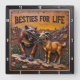 This highly dimensional square wall clock features a bold, close-up illustration of a brown panther (or leopard) and a white, happy goat standing side-by-side. The entire design is rendered in muted brown, tan, and dark leather-like tones, strongly suggesting a deep sculpted relief or Sculpted Leather Look. The panther has textured fur with clear spots and is positioned on the left, while the goat is on the right, smiling with large curved horns. They are surrounded by an elaborate wreath of gnarled, dark branches and leaves carved into the perimeter. The background is a dark leather panel with deep texture. The large, three-dimensional embossed text "BESTIES FOR LIFE" is carved across the top center in a bold, golden serif font. The clock face features a simple clock face border with large, white, numbered tick marks (1 to 12) integrated into the outer frame. The artwork is surrounded by a thick, dark brown decorative border that resembles a black wood frame.