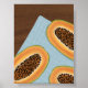 A vibrant illustration featuring fresh papaya halves with bold orange flesh and dark seeds, placed on a cool blue grid cloth against a warm brown background. This tropical design brings a touch of island vibes and boho charm to any space. Perfect for kitchen wall art, fruit-themed prints, summer stationery, or home décor items. A refreshing artwork for those who love colourful modern art with a tropical twist.