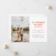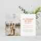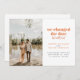 If you had changed your wedding date, but decided you couldn't wait to get married and eloped instead, share your big news with loved ones with this elopement announcement. It features papaya orange and dark grey text with space for a single photo as well as the details about your elopement. The back of the card has space for a personal message.