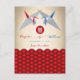 Modern origami red and blue kissing paper cranes with scalloped pattern and a round circle minimalist double happiness symbol on a gold faux foil background. An auspicious and romantic asian / oriental / chinese themed engagement / save the date announcement postcard design which is simple, whimsical and elegant.