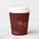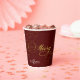 Greet your guests, friends and family with this stylish and modern Holiday Season Christmas paper cups, with a pretty faux gold handwritten script quote "Merry", on an elegant burgundy background, with faux gold glitter. Easily add your event or any other text to customise the template.