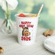 Celebrate the New Year 2026, the Year of the Horse, with this cheerful and bright graphic! It features a happy, cartoon horse mascot in a dynamic vector style. The main colors are vibrant red for the text (Happy New Year 2026) and brown/white for the horse, set against a background of white/gray snowflakes. This design is perfect for New Year's Eve T-shirts, party favors, and calendars. The target audience includes party-goers, people celebrating the Chinese Zodiac, and fans of cute, festive animal graphics. Festive Red & White New Year Horse Mascot