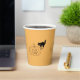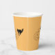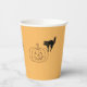 Black cat standing next to a pumpkin jack-o-lantern. Startled cat has arched back and ruffled fur. Background is orange with design replicated three times around cup.
