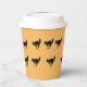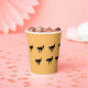 Black cats are startled, with arched back and ruffled fur. Background is orange with design replicated in two lines around cup.