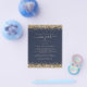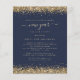 PAPER Gold Glitter Script Navy Blue New Years Eve Party Invitation. A great value PAPER (not card) alternative WITHOUT ENVELOPES at SMALLER size 4.5” x 5.6” and at a budget price. (Standard A6 envelopes are the nearest size to fit). A glam faux glitter border is on each side top and bottom, and New Year is in a stylish script with swashes on a classic navy blue background. Easily personalise the text to your own details. You can also change the text and background colours via the customise further option if you wish.
