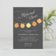 Modern wedding rehearsal dinner invitation features a night sky with vibrant hanging paper lanterns. Charcoal black background with light grey, citrus yellow, and orange colours.