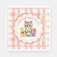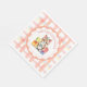 Adorable personalised Happy Birthday kitten themed paper napkins with a sweet watercolor kitten holding a cupcake surrounded by birthday gifts. Charming coral plaid background.