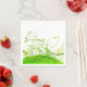 Paper napkin is shown with a lovely green floral swirl print on a white napkin.